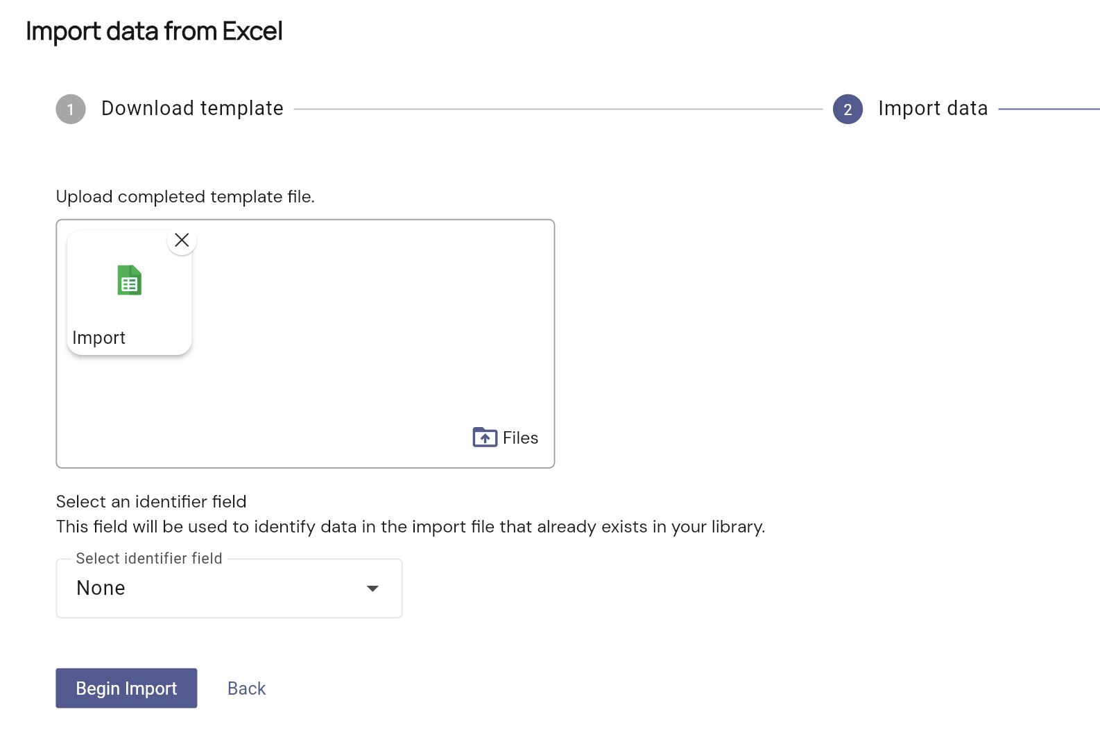 Upload Excel file: Note: If you wish to update an existing item, select the record identifier to find and update it. This is not required if you are only entering new data.
