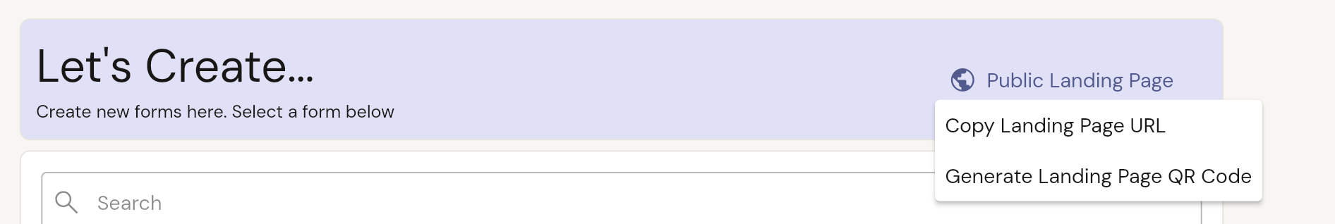 Choose Public landing page or public form link: Choose the specific type of item you wish to create from the available options.